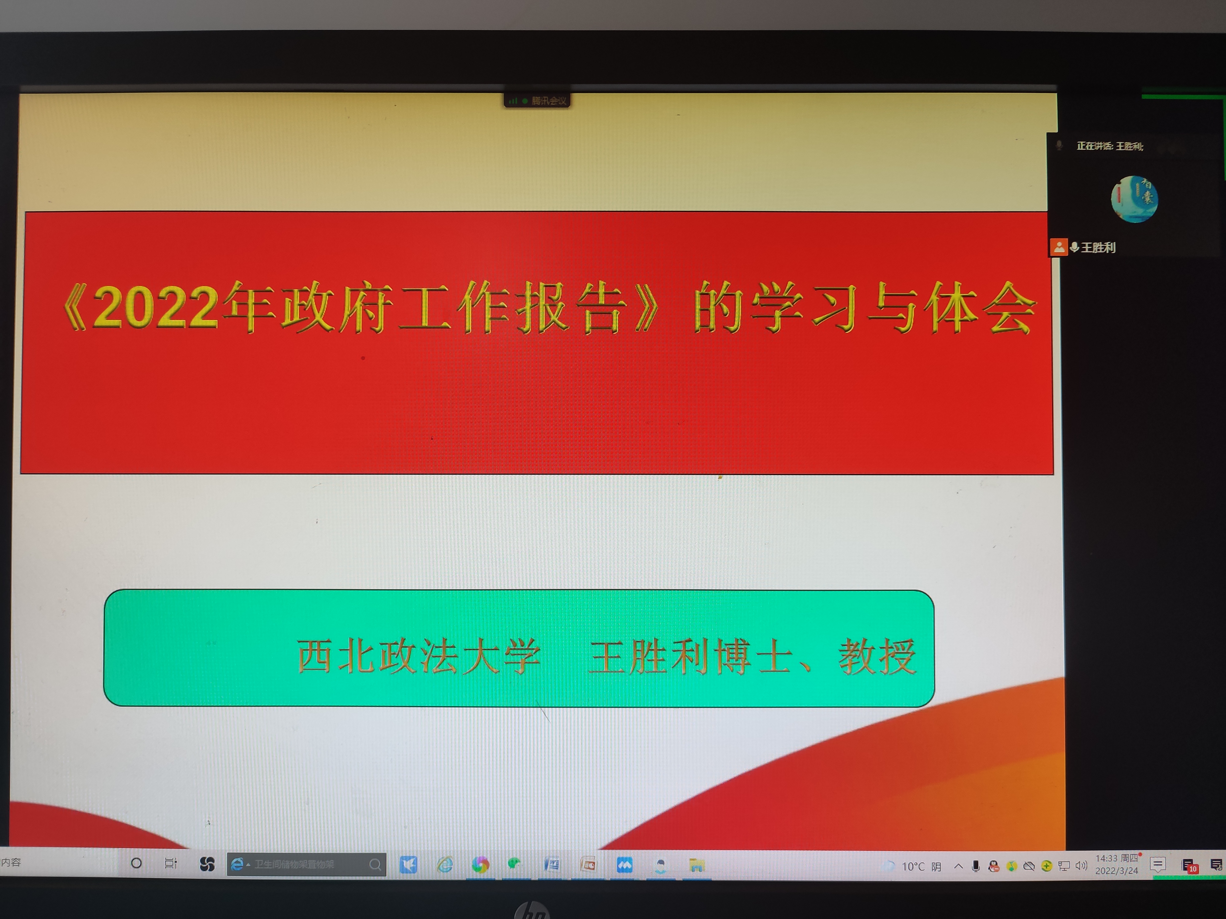 3月24日,院长王胜利为本科生上线上思政课,结合专业课内容,讲解全国“两会”精神和《2022年政府工作报告》心得体会。他从“我国2021年取得的重大成就”“2022年面临复杂严峻环境和‘三重压力’”“2022年主要任务和新举措”三方面入手,分享了自己的观点。他谈到,要认识到我国经济发展面临的风险挑战增多,坚持“稳中求进”的总基调,围绕中央提出的继续做好“六稳”“六保”工作目标,统筹疫情防控和经济社会发展,以优异的经济发展成绩迎接党的二十大胜利召开。