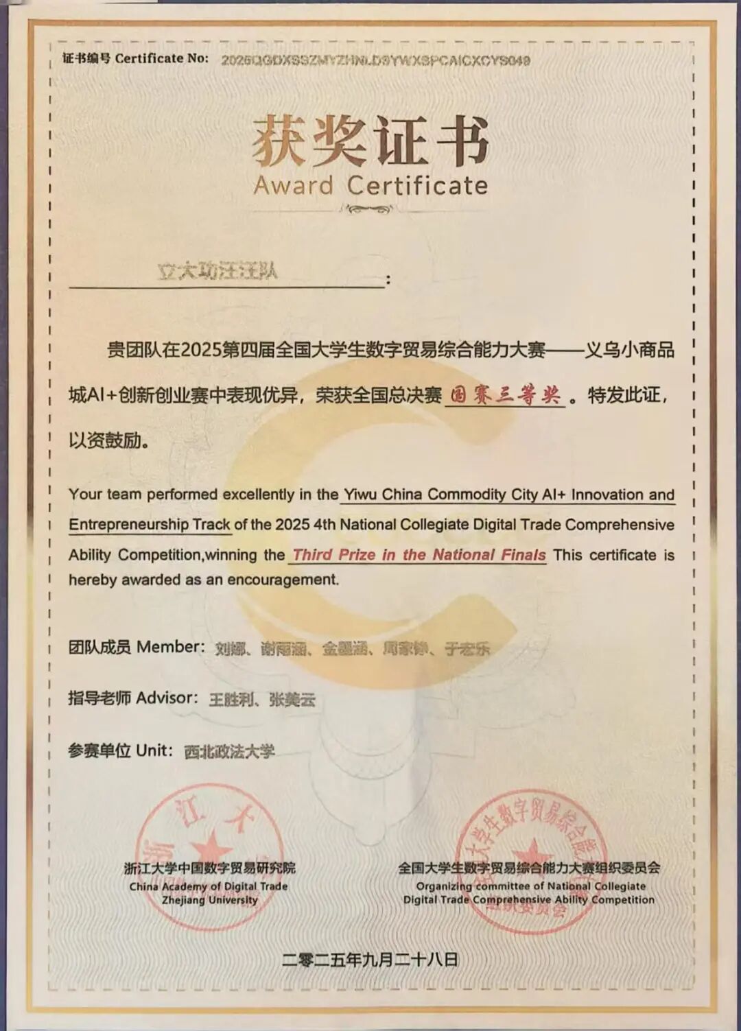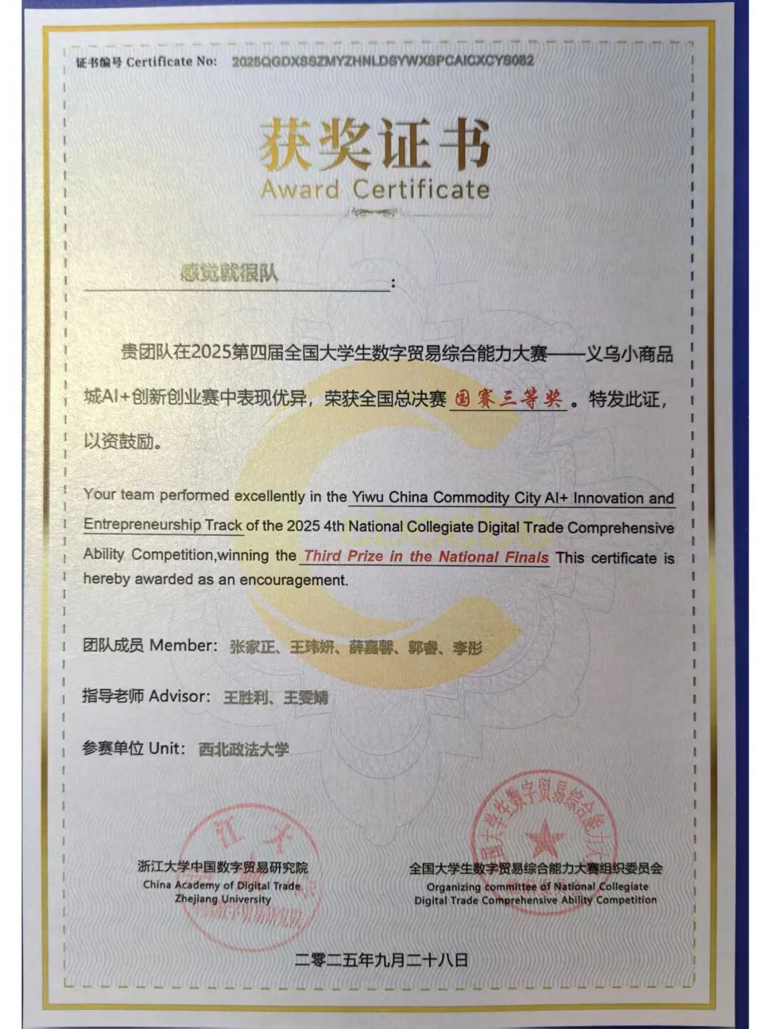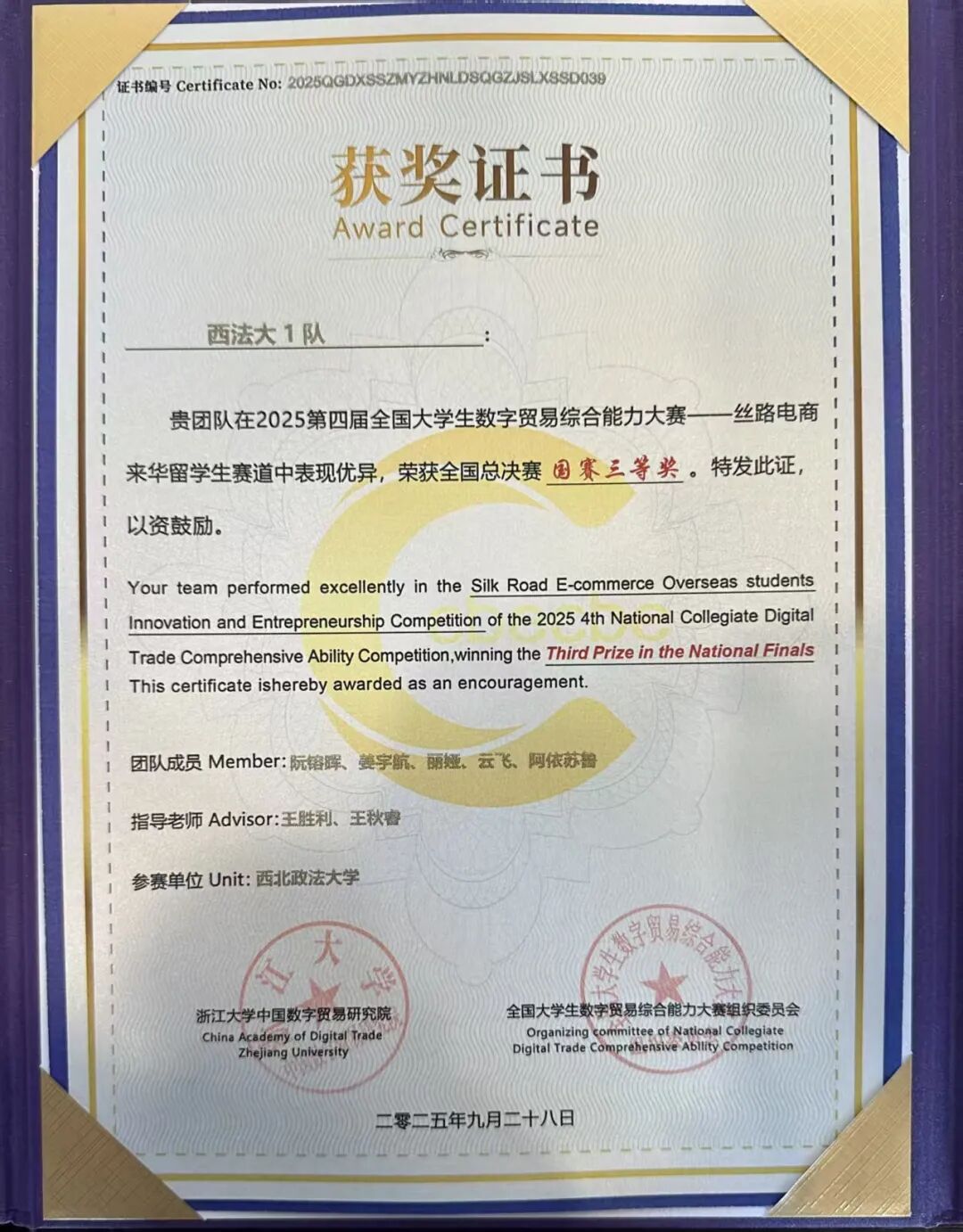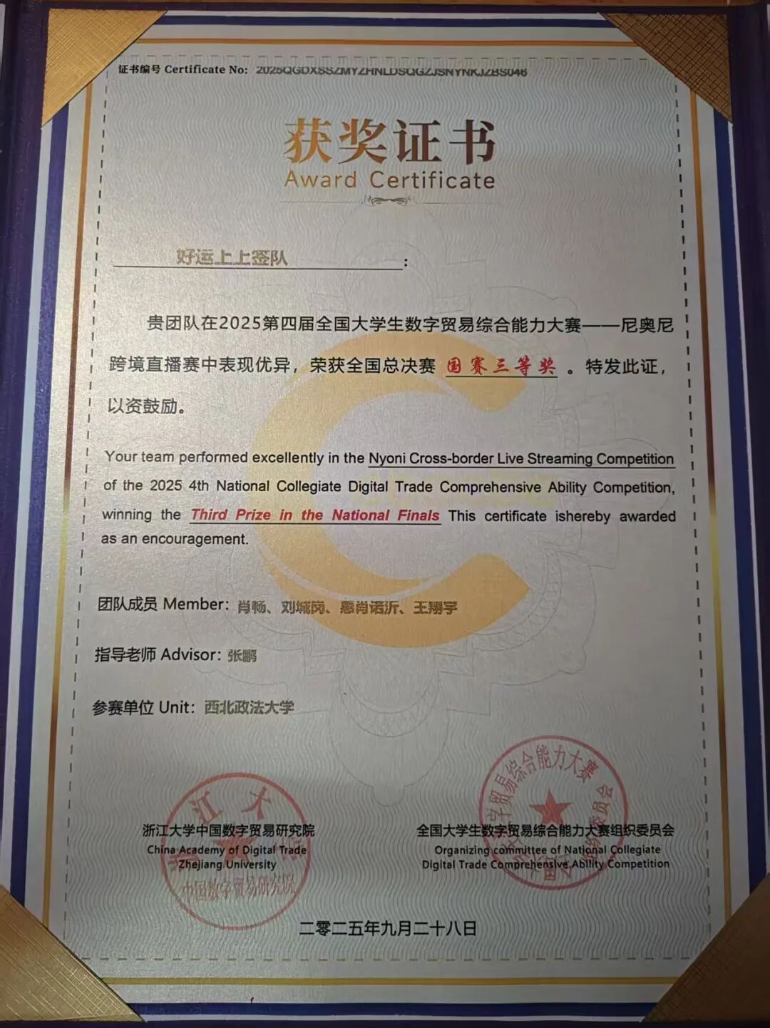 西北政法大学作为陕西赛区承办单位,精心组织,层次选拔,来自意甲直播 、商学院、国际教育学院等7支代表队进入全国总决赛,分别参与“1688大学生AI创业赛”“义乌小商品城AI+创新创业赛”“尼奥尼跨境直播赛”“东方杯丝路电商来华留学生创新创业赛”四大赛道的角逐,最终斩获一等奖2项、二等奖1项、三等奖4项,西北政法大学获评全国“优秀组织奖”,意甲直播 李隆玲和段琳两位教师荣获“优秀指导教师”称号。