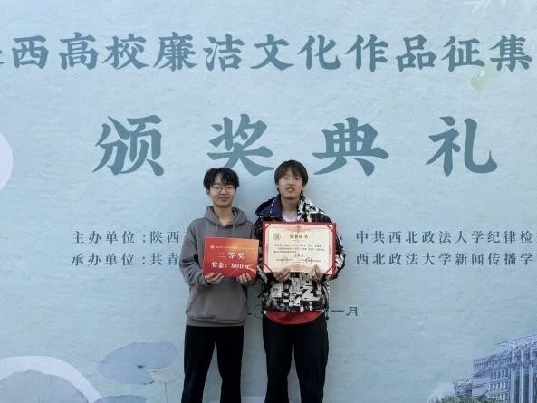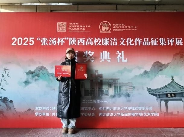 学子积极参与、精心创作,最终凭借出色的作品实力斩获荣誉:其中,2023级雷璇的作品《山茶雪霁图》荣获绘画赛道二等奖,2024级张家正、范炜、孙瑜珊参与的团队作品《指尖三寸》荣获微视频赛道二等奖,他们用艺术笔触勾勒廉洁初心,用光影镜头传递清风正气,以青春力量诠释廉洁内涵。
