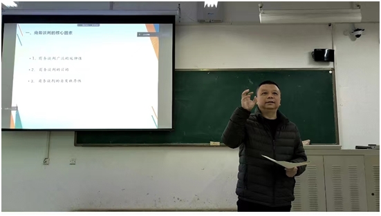 第二部分是陈亨老师进行讲座分享。首先,陈老师以丰富生动的案例和史料、风趣幽默的语言,从商务谈判广泛的延伸性、商务谈判的目的、商务谈判的自发性展开讲述商务谈判的核心因素。其次,他展开讲述了不同时期背景下的影响商务谈判的因素和商务谈判中隐藏的因素。再次,陈老师从商务谈判礼仪、商务谈判的语言运用、商务谈判的场所选择、商务谈判的其他因素等介绍了实践方面的技巧。最后,陈亨老师结合自身参与谈判的真实经历及典型案例讲述了对于商务谈判实践操作方面的深刻认识,并提出该领域问题研究及应用的深刻性和广博性,并向同学们推荐了诸多人文社科名著,鼓励大家广泛阅读,积极实践,打破思维的禁锢,努力向“守、破、立”的人生大境界迈进。