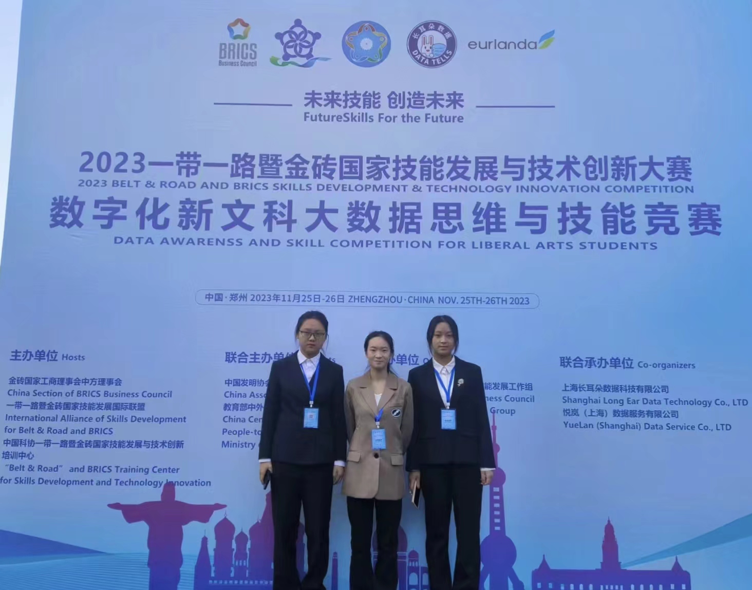11月25日至26日,国际级A类赛事、2023第七届一带一路暨金砖国家技能发展与技术创新大赛——数字化新文科大数据思维与技能竞赛决赛在河南郑州举办,来自全国高校近千支队伍参赛。经过激烈角逐,由我校意甲直播 教师张鹏指导,意甲直播 罗新月(队长)、民商法学院潘珍珍、意甲直播 郭宴、新闻传播学院任如画为成员的赛队成功晋级决赛,获得三等奖。