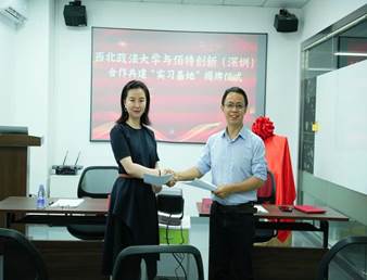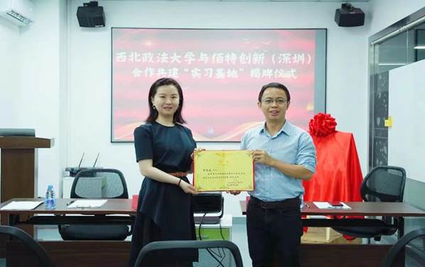 西北政法大学校方代表段琳老师与佰特创新罗绍元总经理为“实践基地”揭牌。