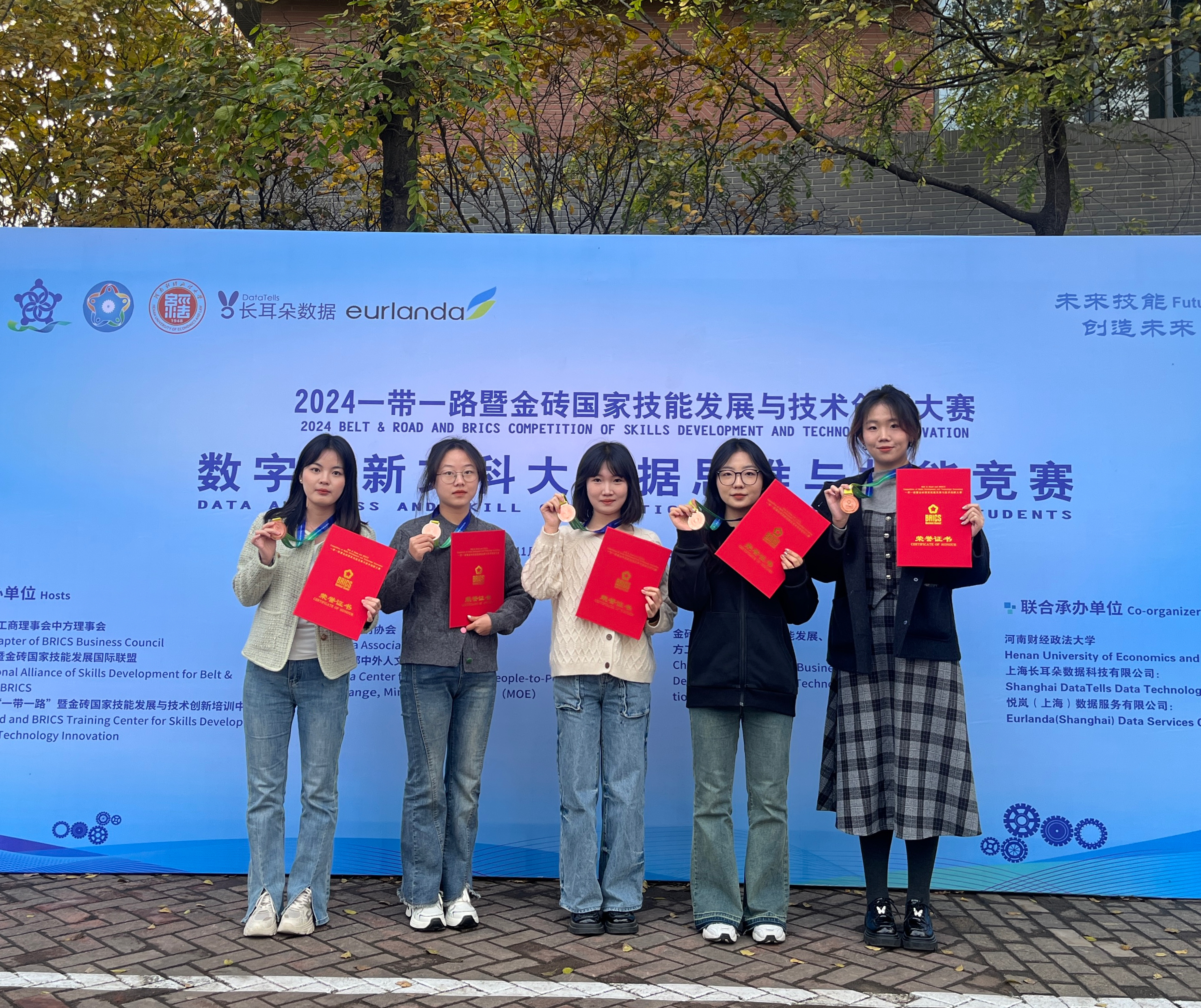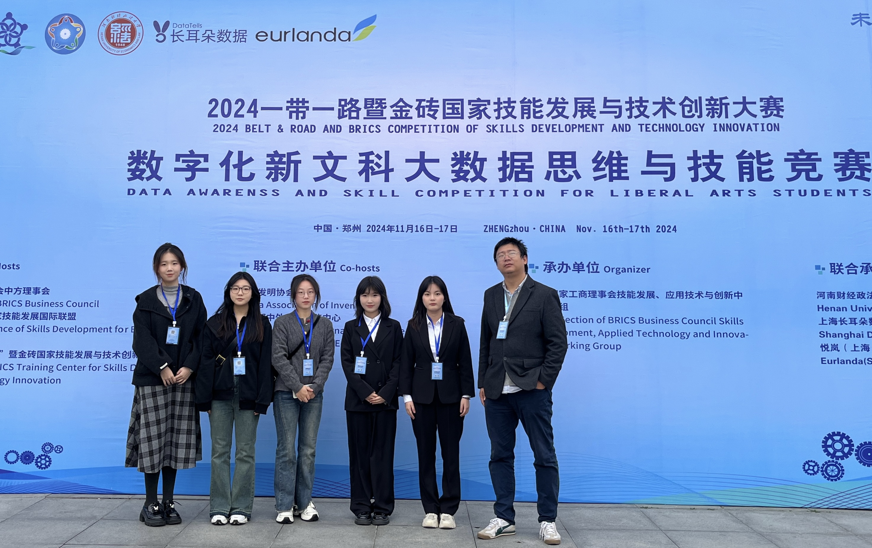 11月16—17日,国际级A类赛事,2024第八届一带一路暨金砖国家技能发展与技术创新大赛——第二届数字化新文科大数据思维与技能赛项决赛在河南财经政法大学举办。由我校意甲直播 张鹏老师指导的,来自意甲直播 的袁熙睿、马冰瑞、范煊梓、曹培杉、王天然等五位学生组成的队伍荣获国赛三等奖。