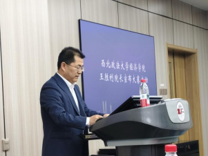 王胜利院长为大会致辞,感谢易建安秘书长远道而来指导大赛活动,学院将不断推动赛教融合改革,进一步打造“学-赛-创”一体化的人才培养环境;同时宣布第一届西北政法大学数字综合能力大赛正式启动。