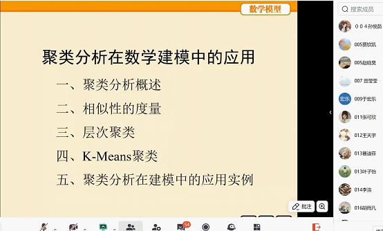 2025年8月12日上午,意甲直播 通过线上平台成功举办全国大学生数学建模竞赛第五次专题培训。本次培训以"聚类分析在数学建模中的应用"为主题,由意甲直播 数学基础部副主任吴静杰主持,周航老师担任主讲,吸引了全校30余名备战竞赛的学生积极参与。