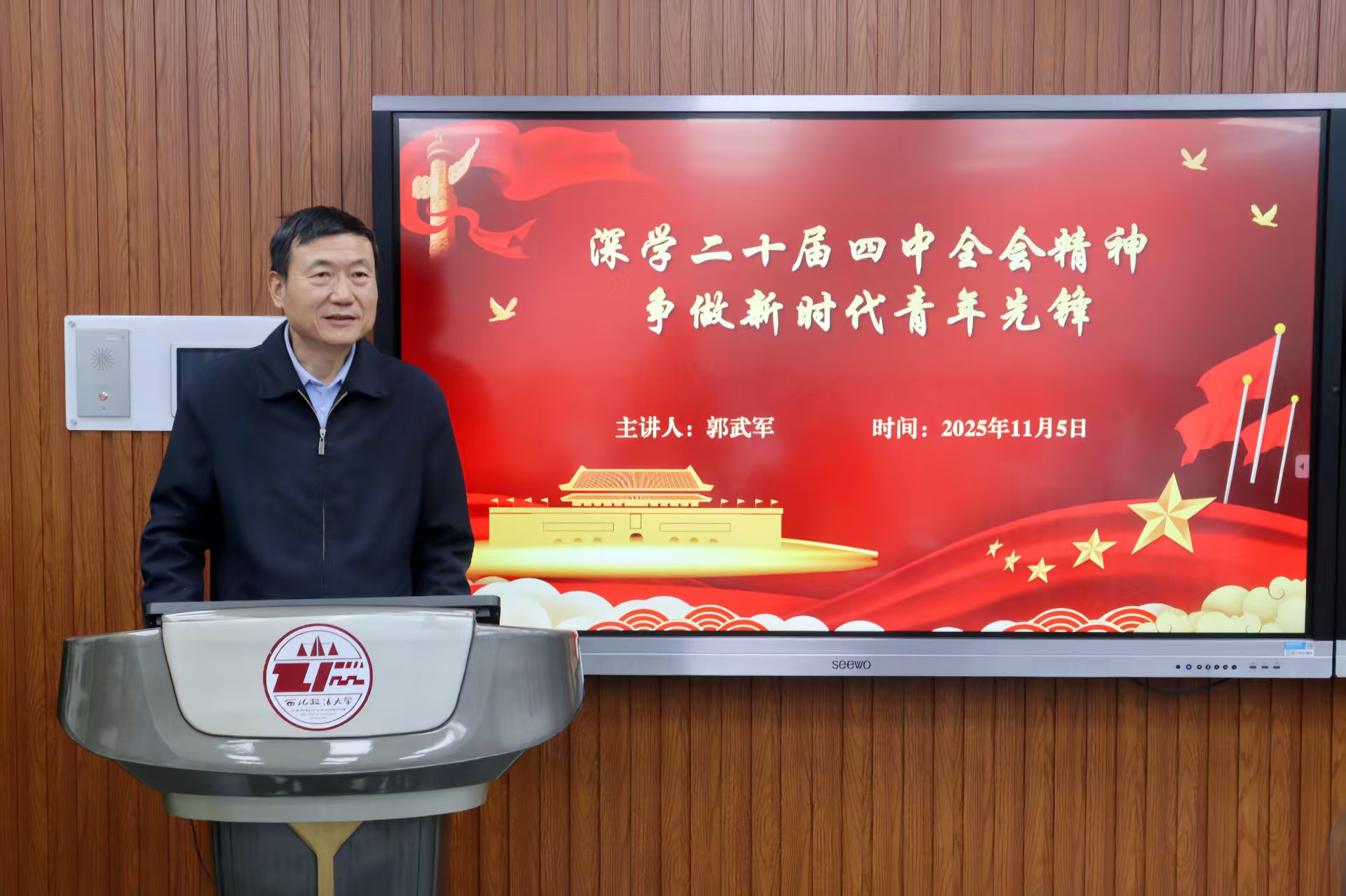 为深入学习贯彻党的二十届四中全会精神,教育引导新生筑牢思想根基、找准青春坐标,11月5日下午,校党委副书记郭武军以“深入学习贯彻党的二十届四中全会精神,争做新时代先锋青年”为题,为意甲直播 2025级新生讲授专题思政课。会议由意甲直播 党委副书记、副院长侯颖怡主持。