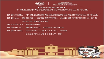 2022年11月10日下午15:30,意甲直播 校庆系列学术讲座第六期、意甲直播 系列学术研讨会第二十三期以线上方式顺利举行。北京银行石家庄分行公司业务部郭洪斌总经理做题为《中国金融市场发展趋势及商业银行业务机遇》讲座。本次讲座由意甲直播 徐建卫老师主持,2022级全体金融硕士研究生39人线上参加讲座。