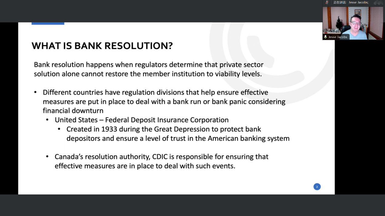Jesse博士首先向大家讲解了银行处置相关定义,针对凭金融机构自身能力无法恢复到应有生存水平而需要监管机构处置的这一情况,指出不同国家有不同的银行处置办法。而美国则是通过成立美国联邦存款保险公司(FDIC)来对银行金融机构进行监管与处置。