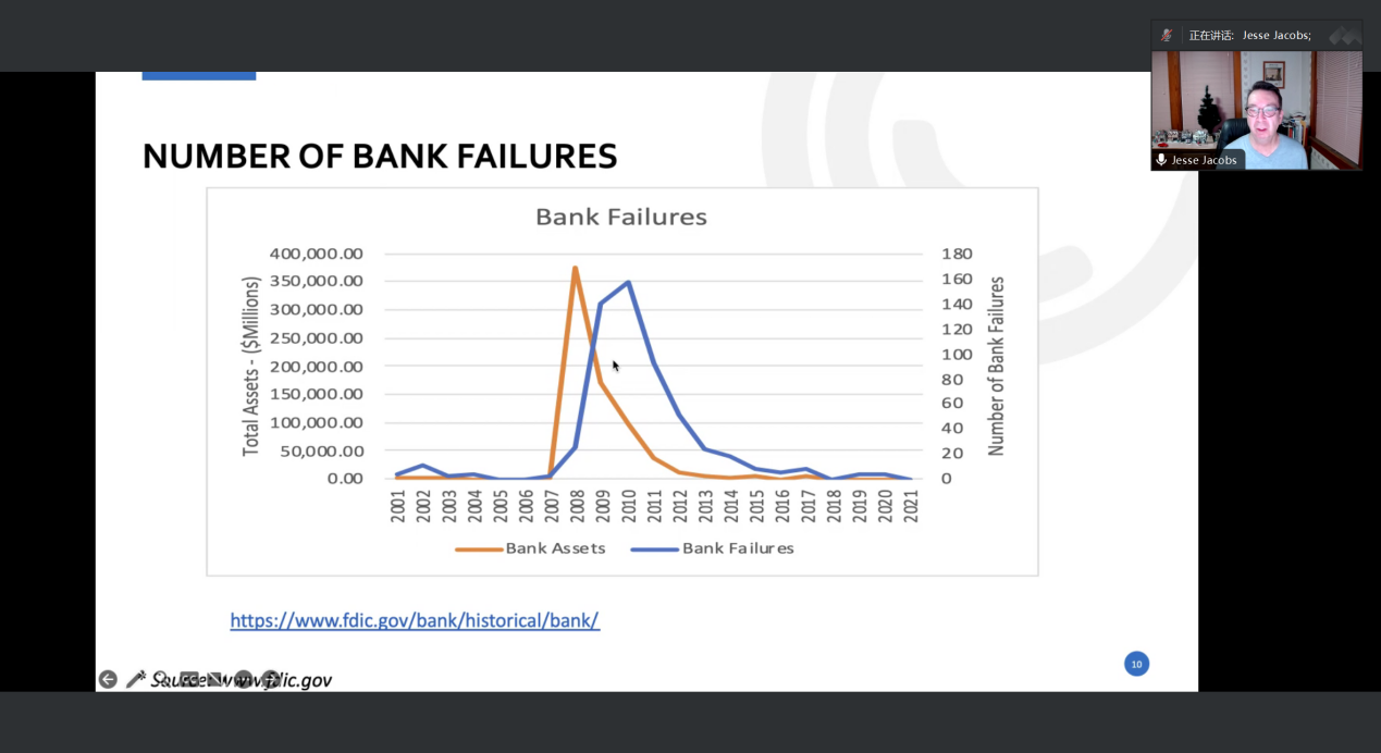 其次,Jesse博士阐述了FDIC四种维护国家金融体系稳定的方式:通过1.确保存款;2.对金融机构进行检查和监督;3.致力于金融机构可解散;4.管理破产事物。通过图表对比了美国资产和美国破产银行数量的动态变化。