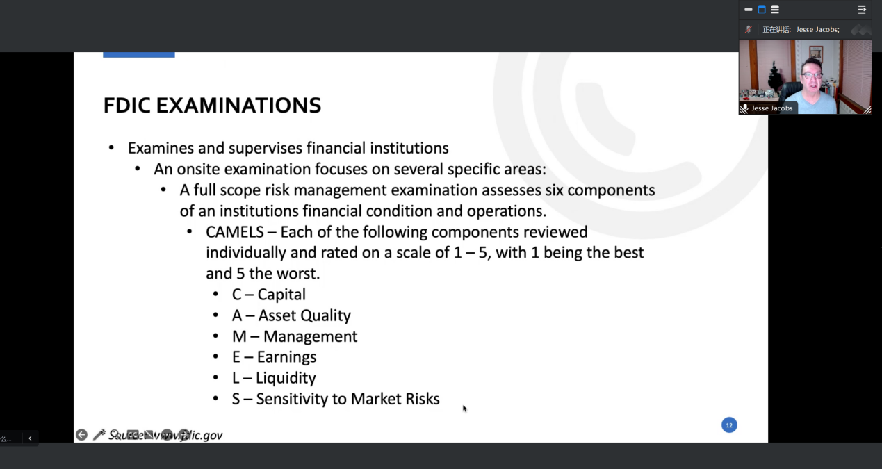 最后,针对银行机构的监管方面, Jesse博士详细讲解了全面风险管理检查评估机构财务状况和运营的综合评估指标:“CAMELS”,即“资本规模”、“资产质量”、“管理能力”、“盈利能力”、“流动性””市场风险敏感度“等六个组成部分。