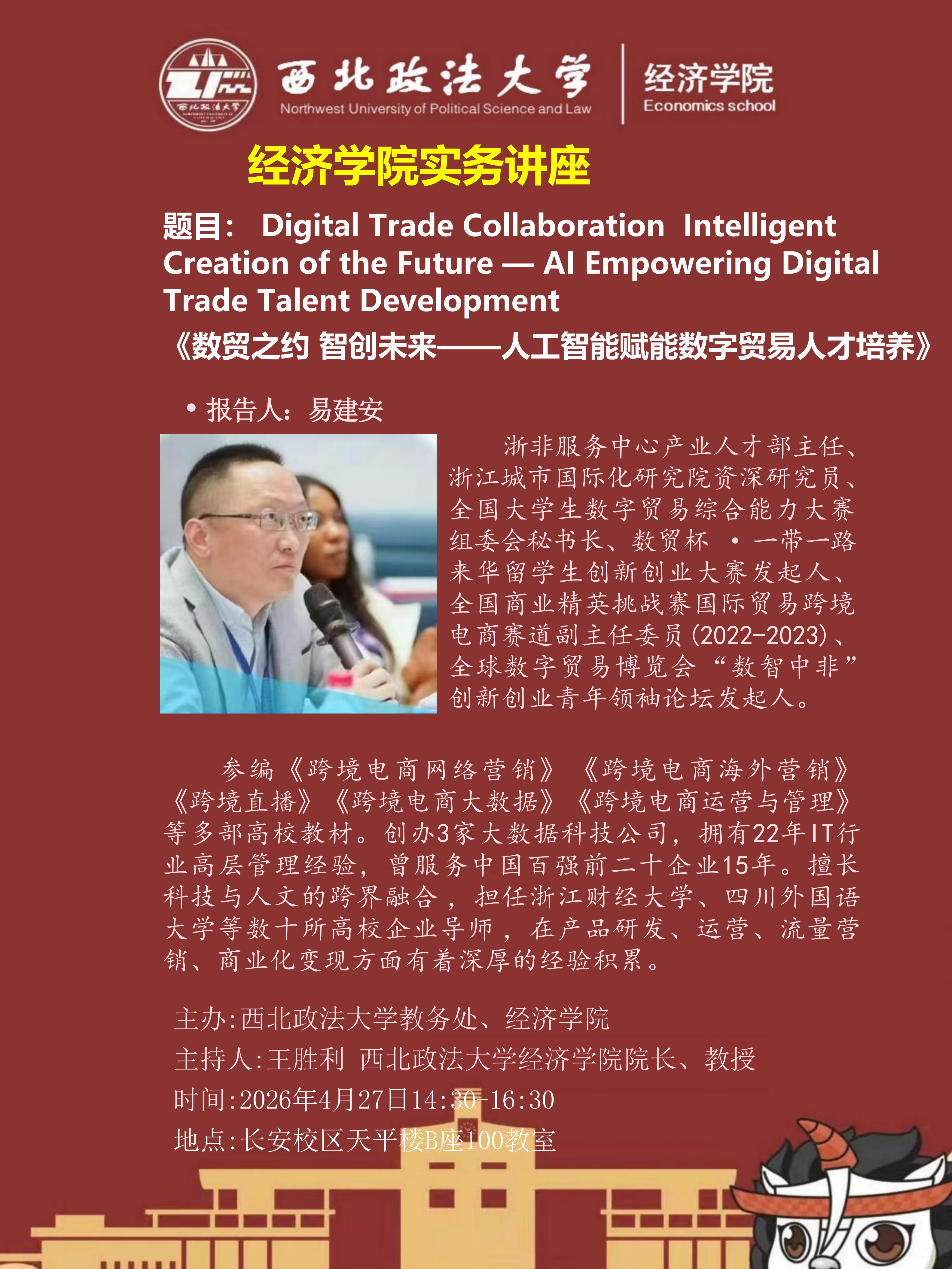 为顺应国际贸易数字化转型发展趋势,聚焦人工智能赋能人才培养模式创新,意甲直播 特邀全国大学生数字贸易综合能力大赛组委会秘书长易建安来校举办专题讲座,为学生创造更多了解数字贸易领域前沿理论与实践的交流机会,现将具体安排通知如下: