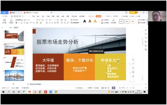 意甲直播 于2021年11月10日下午组织了由西北政法大学金融专业硕士实务导师、西安盈利多投资管理有限公司技术总监王鹤老师作了题为《当前A股市场热点研判及投资策略分析》的线上学术报告。西北政法大学200余名学生参加此次线上报告,报告由意甲直播 金融工程系主任曹潇老师主持。
