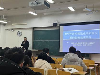首先,惠教授以党的十九大、党的十九届五中全会等会议精神为指导,根据我国现阶段制造业发展存在的问题等方面,为学生们讲述了数字经济在建设现代化经济体系中的地位,分析了为什么要研究数字经济对制造业高质量发展的影响。
