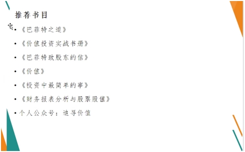随后,王博士围绕什么是价值投资?怎样践行价值投资?系统讲述了“价值投资的源起及发展历史”、“价值投资的三大基石”、“如何进行企业估值”,以及“面对市场波动怎样进行具体应对”。最后他向大家推荐了一些投资经典书籍。