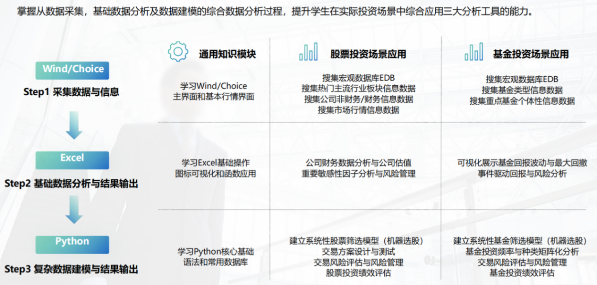 职业力培养:金融行业核心技能(Excel数据分析、Chioce金融终端、Python金融数据分析),无缝衔接职场工作,弥补大学知识学习与企业用人需求的鸿沟。
