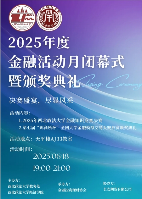 2025年西北政法大学金融活动月闭幕式暨金融知识竞赛决赛、第七届“郑商所杯”全国大学生金融模拟交易大赛校赛颁奖典礼将于6月18号(周三)19:00在西北政法大学长安校区天平楼AJ33教室举行。